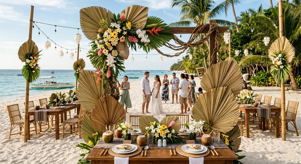 Saribus rotundifolius leaves and other tropical foliage are often added to arrangements to create a distinctly Filipino aesthetic.